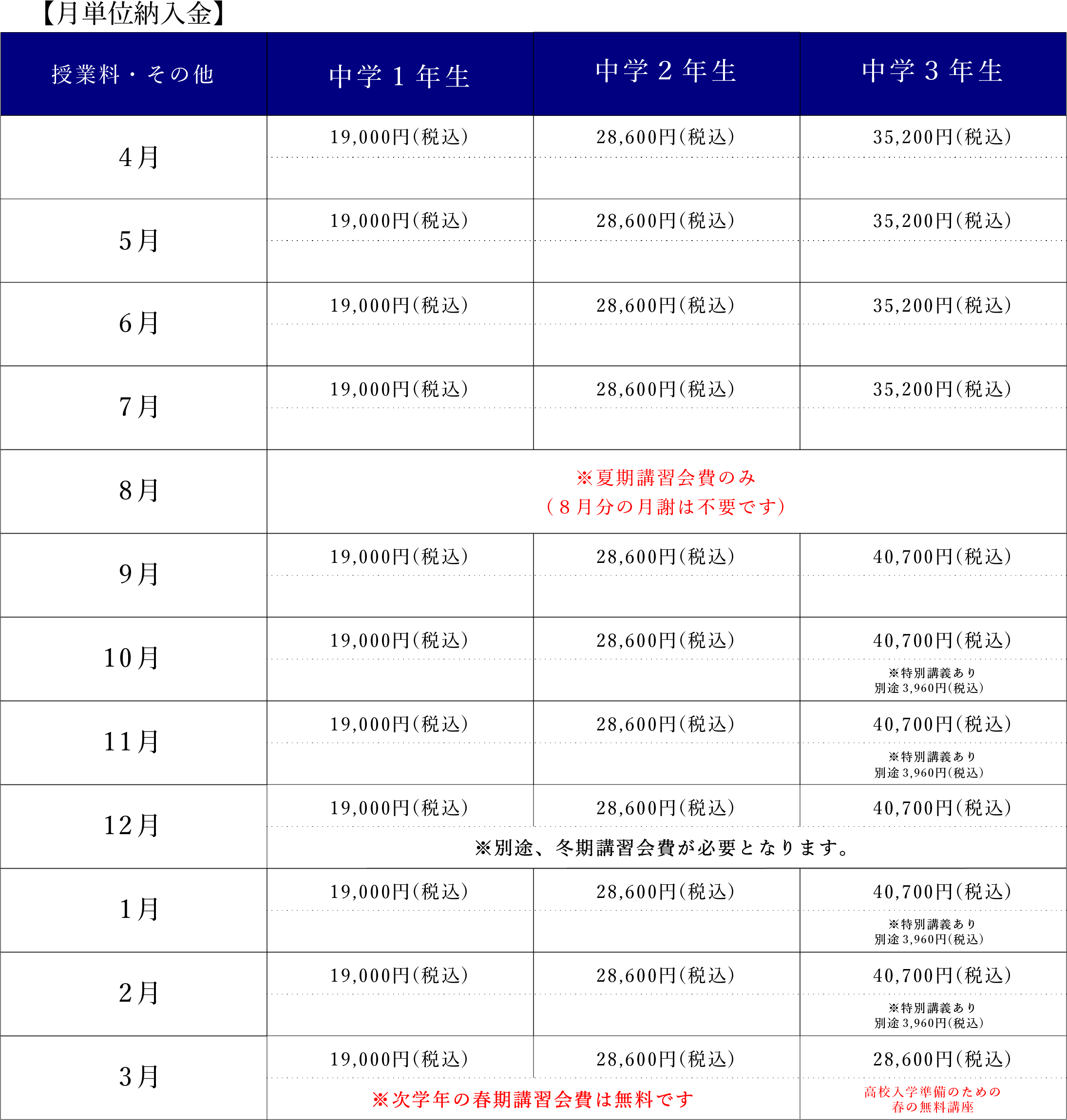 ※ 設備費と教材費②は、4月・7月・10月・1月の年4回、3ヶ月分まとめてご納入いただきます。